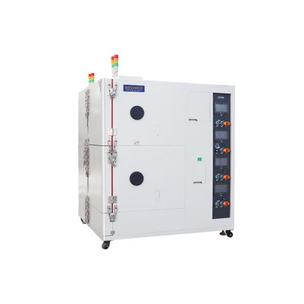 Sanwood thermal aging test chamber 4-in-1 design is a customised design for battery manufacturer, which is simulating the different temperatures conditions in each room. So there are 4 controllers in this design. Each room can be set a temperature different from others. The refrigeration system can be one-stage refrigeration system or two stage system, depends on the temperature control range.